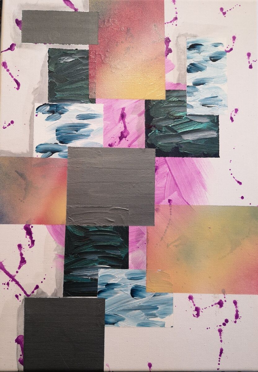 Explosion of shapes and colours created using brush, spray paint, stencils and masking tape. Well, is it a treat?