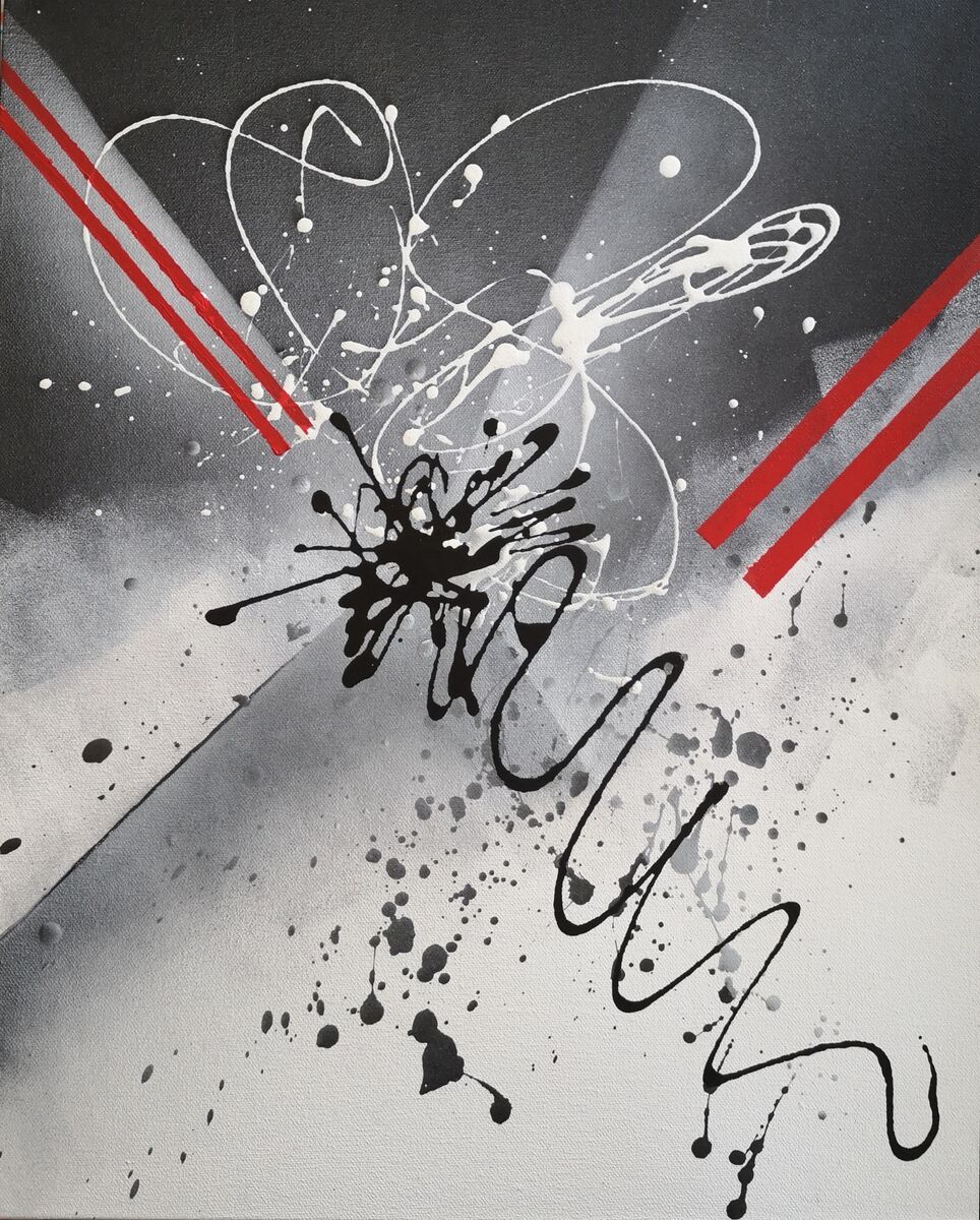 Explosion of shapes and colours created using brush, spray paint, stencils and masking tape. Well, is it a treat?