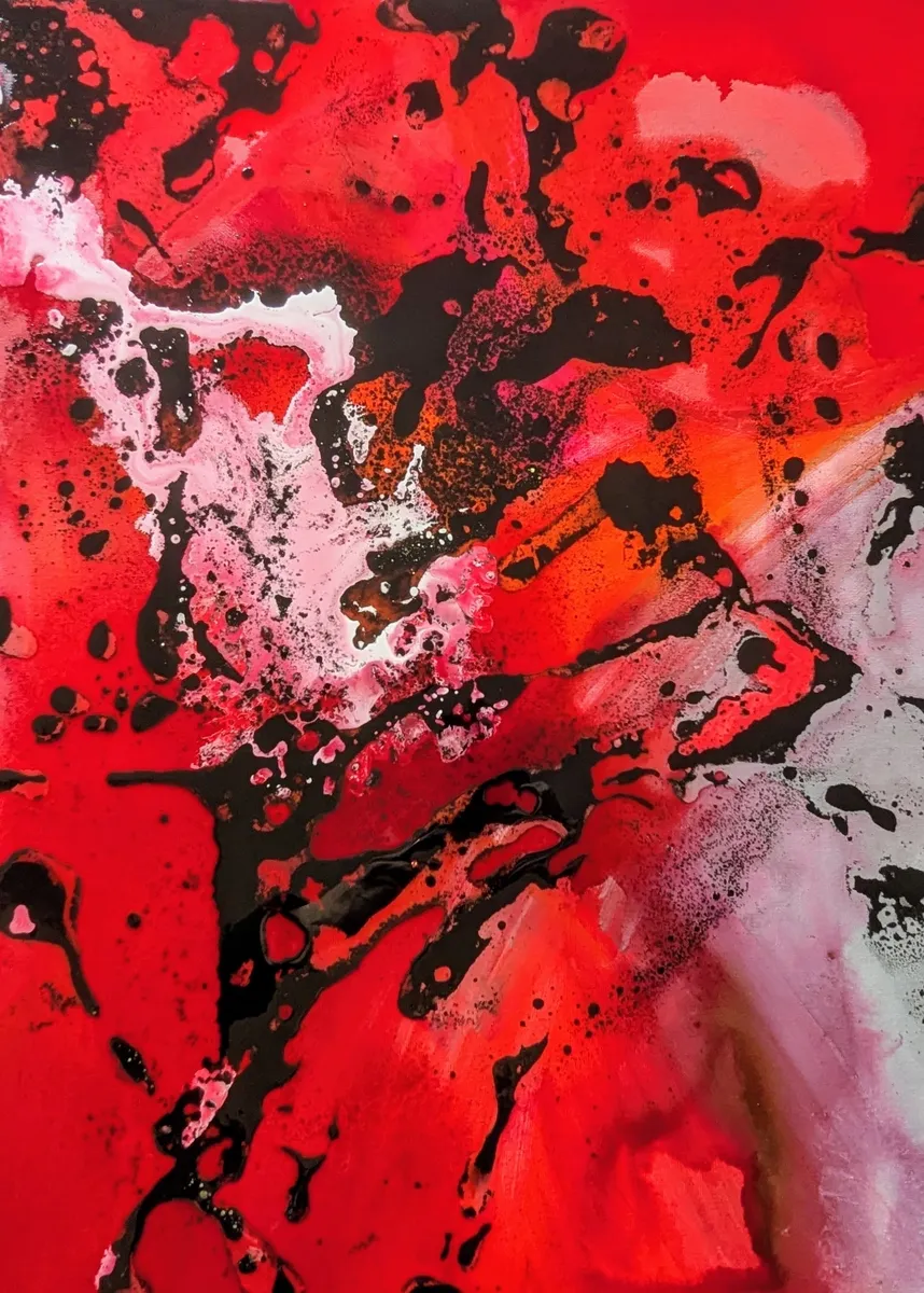 Lacing the bright red with black oil paint mixed with white spirit and blended with methylated spirit to create floating bubbles.