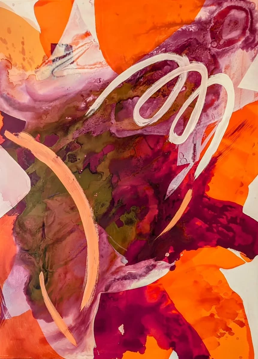 Lacing the bright red with black oil paint mixed with white spirit and blended with methylated spirit to create floating bubbles.
