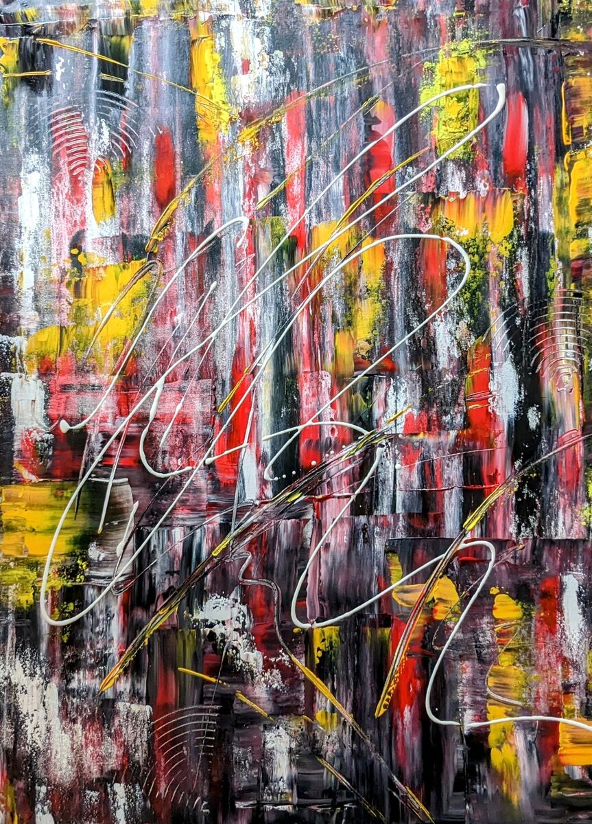 Bright colours, shapes and lines. Ditched the palette knives for this one.