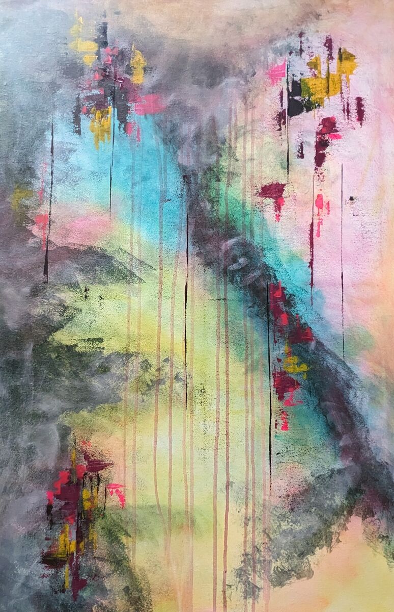 Exploring a new technique .... No brushes, just rollers and sponges. A small step away from my normal go to colours. Still, brought vibrancy to canvas.
