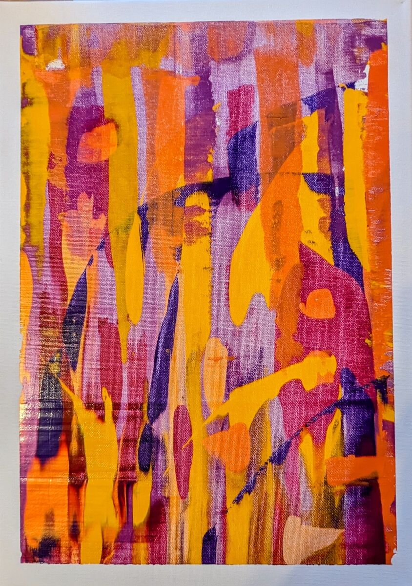 Lively, bright & vivid colours. Playing with them and applying them with a squeegee. Art can be created with many different utensils.