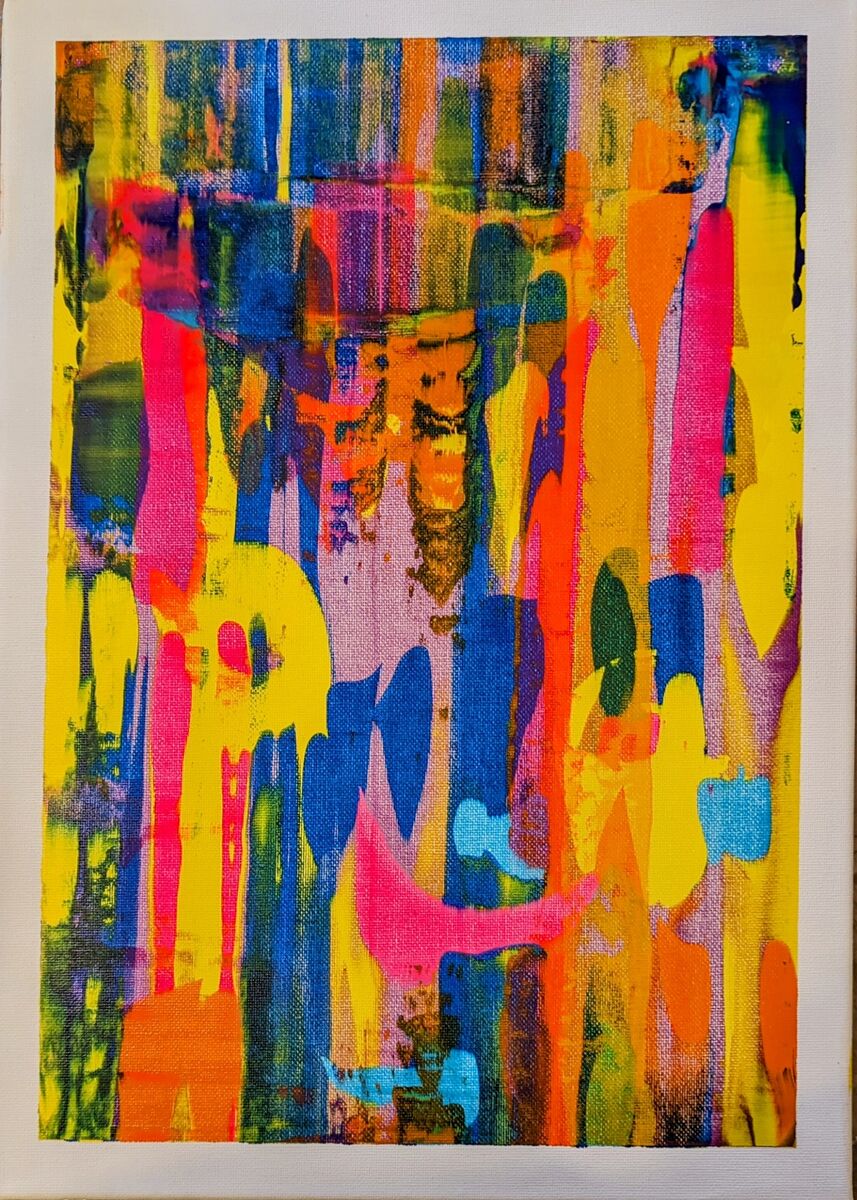 Lively, bright & vivid colours. Playing with them and applying them with a squeegee. Art can be created with many different utensils.